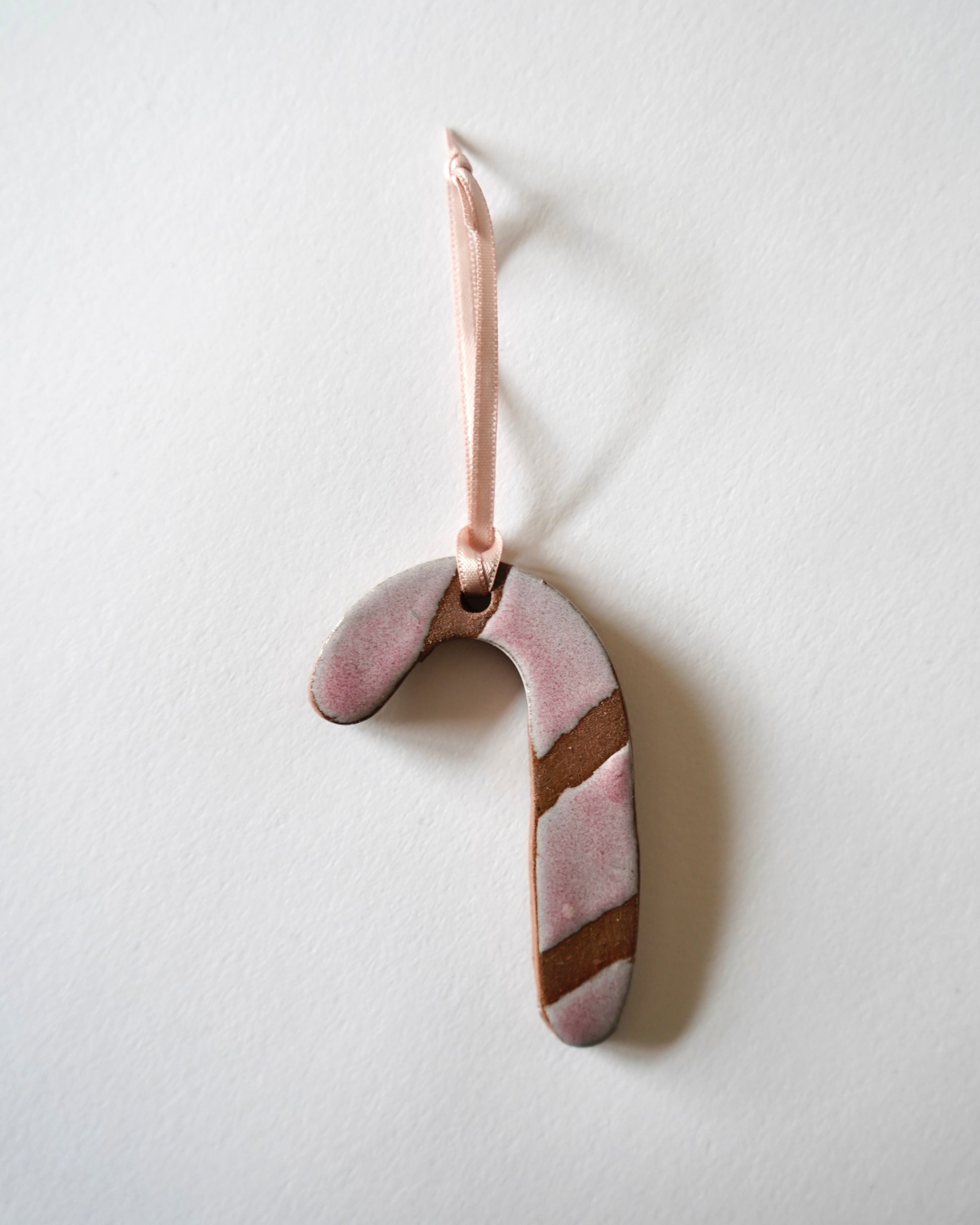 Handmade candy cane ornaments in red stoneware with glossy pink stripes.
